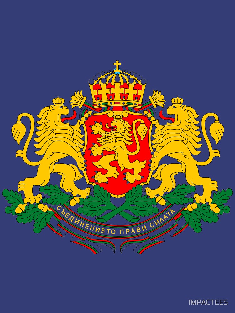 The coat of arms of Bulgaria consists of a crowned golden lion rampant over a dark red shield; above the shield is the Bulgarian historical crown. The shield is supported by two crowned golden lions rampant; below the shield there is compartment in the shape of oak twigs and white bands with the national motto "Unity makes strength" inscribed on them.